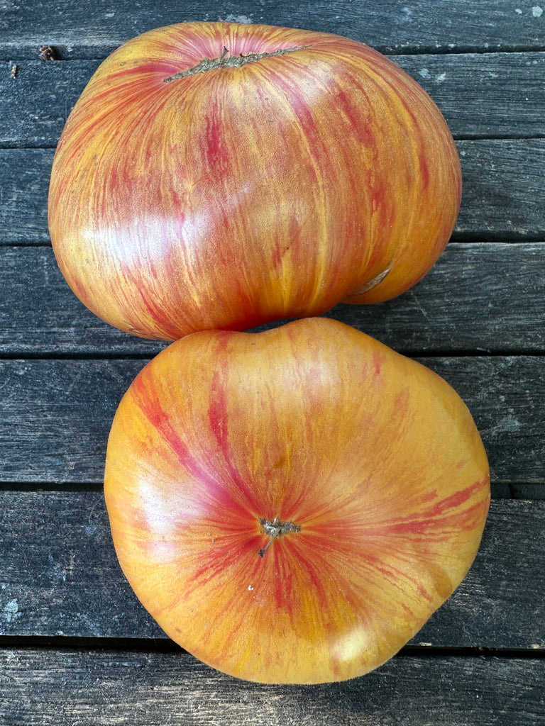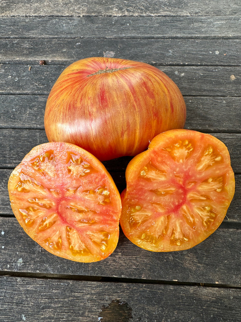Fruits de 200 à 400 grammes à robe orange finement striée de rouge.