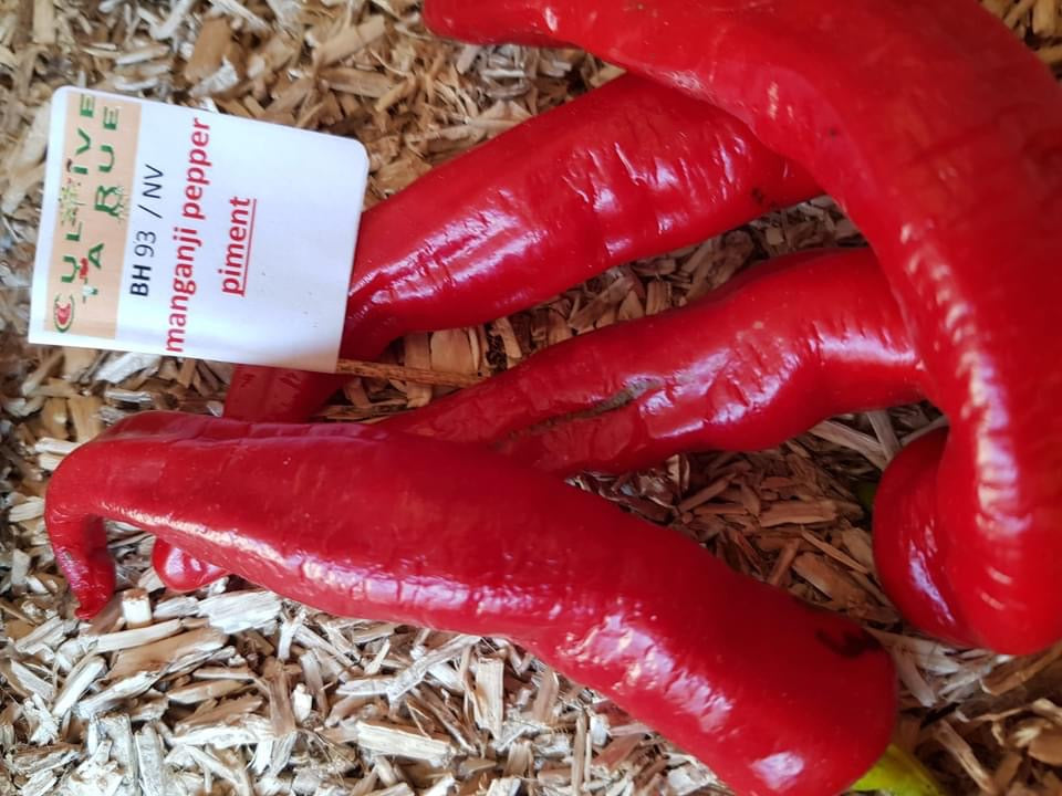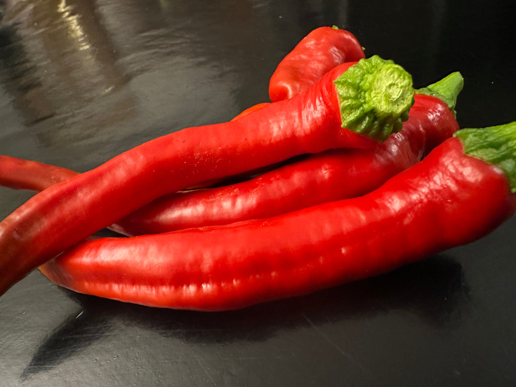 Piment long de 10 à 20 cm, peau lisse et brillante de couleur rouge.