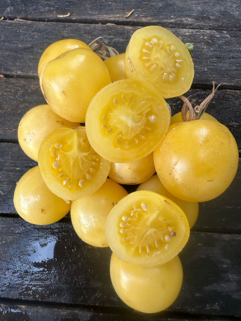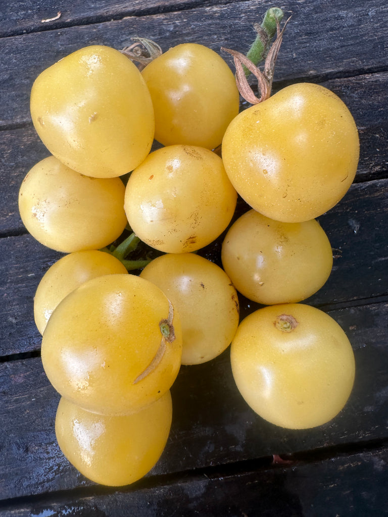 Fruits de type cerise ronde à robe blanche.