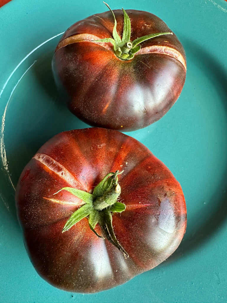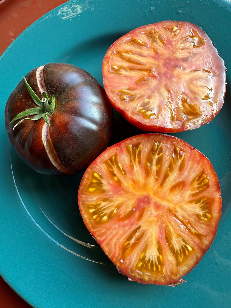 Fruits de 150 à 250 grammes à épiderme orange et aux épaules noires, conséquence des anthocyanes.
