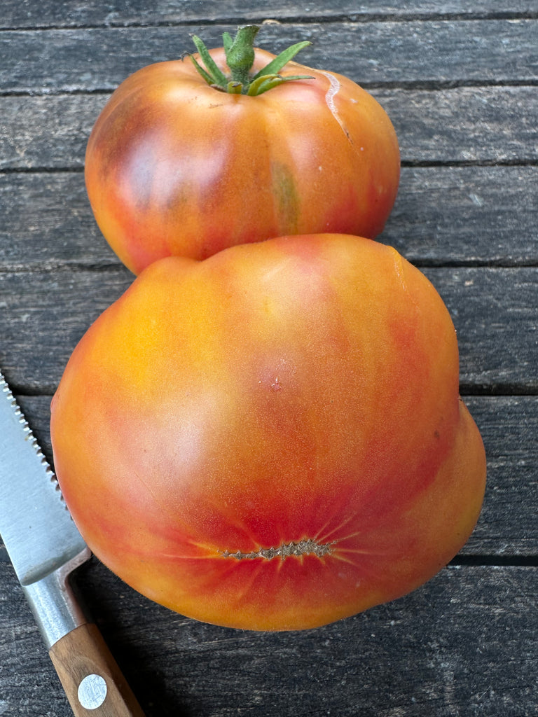 Fruits de 200 à 300 grammes à épiderme orange, aux épaules marquées par les anthocyanes.