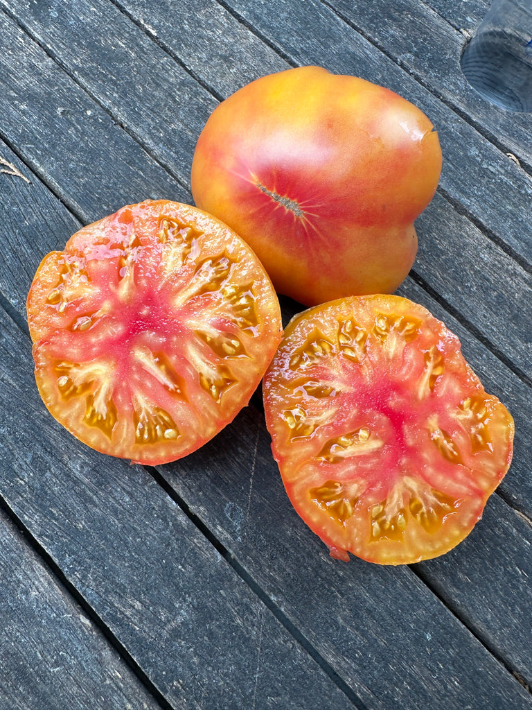Chair bicolore, jaune d'or et rose. Saveur fruitée.